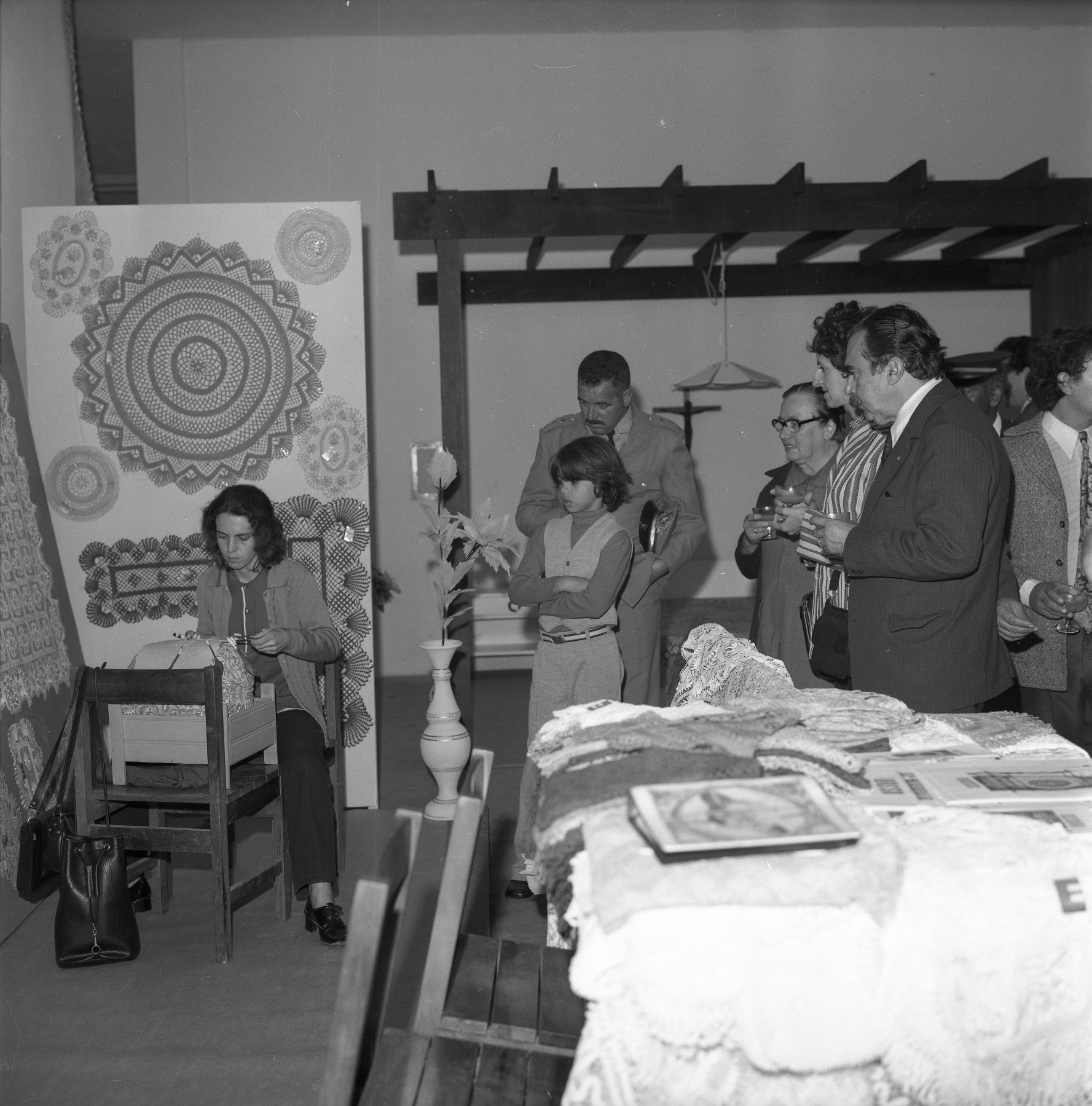 Fotografia quadrada preto e branca da Inauguração da Feira de Artesanato na Cidade Universitária. Em área interna, 5 pessoas observam em pé uma pessoa que está sentada e faz uma peça artesanal. Ao lado esquerdo das pessoas, mesa retangular coberta por peças artesanais.