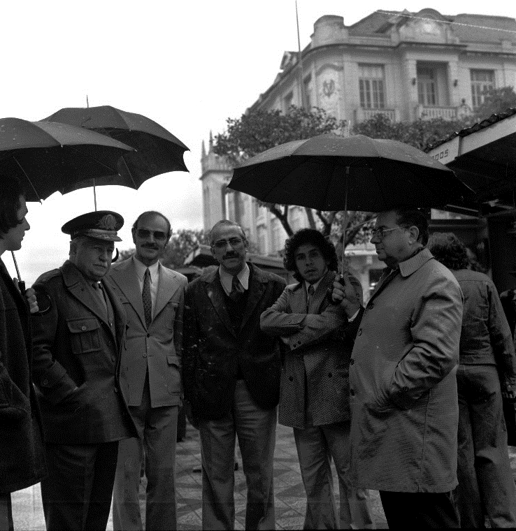 Fotografia quadrada preto e branca da Inauguração da Feira do Livro. Seis homens aparecem na fotografia, estão em uma calçada lado a lado, três seguram guarda chuvas preto, um deles é Hélios Homero Bernardi. Ao fundo, prédio de 4 pavimentos.