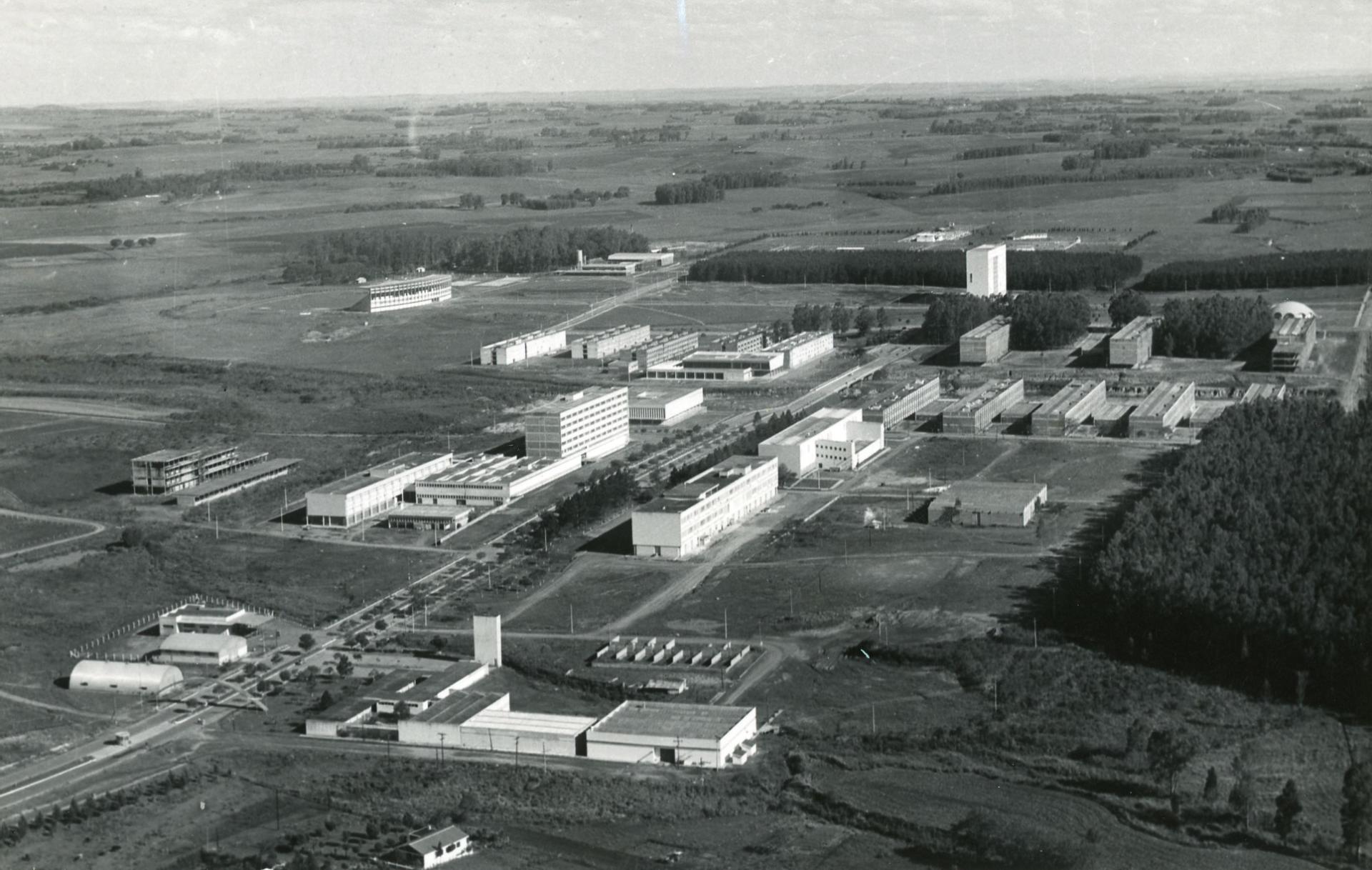 1977 - Criação do Centro de Ciências da Saúde. Nova reestruturação nos Centros de Ensino, criando, transformando ou alterando a denominação das oito Unidades de Ensino para Centros e criando as Pró-Reitorias e subunidades (Foto UFSM.1977.167.001 de fotógrafo não identificado)