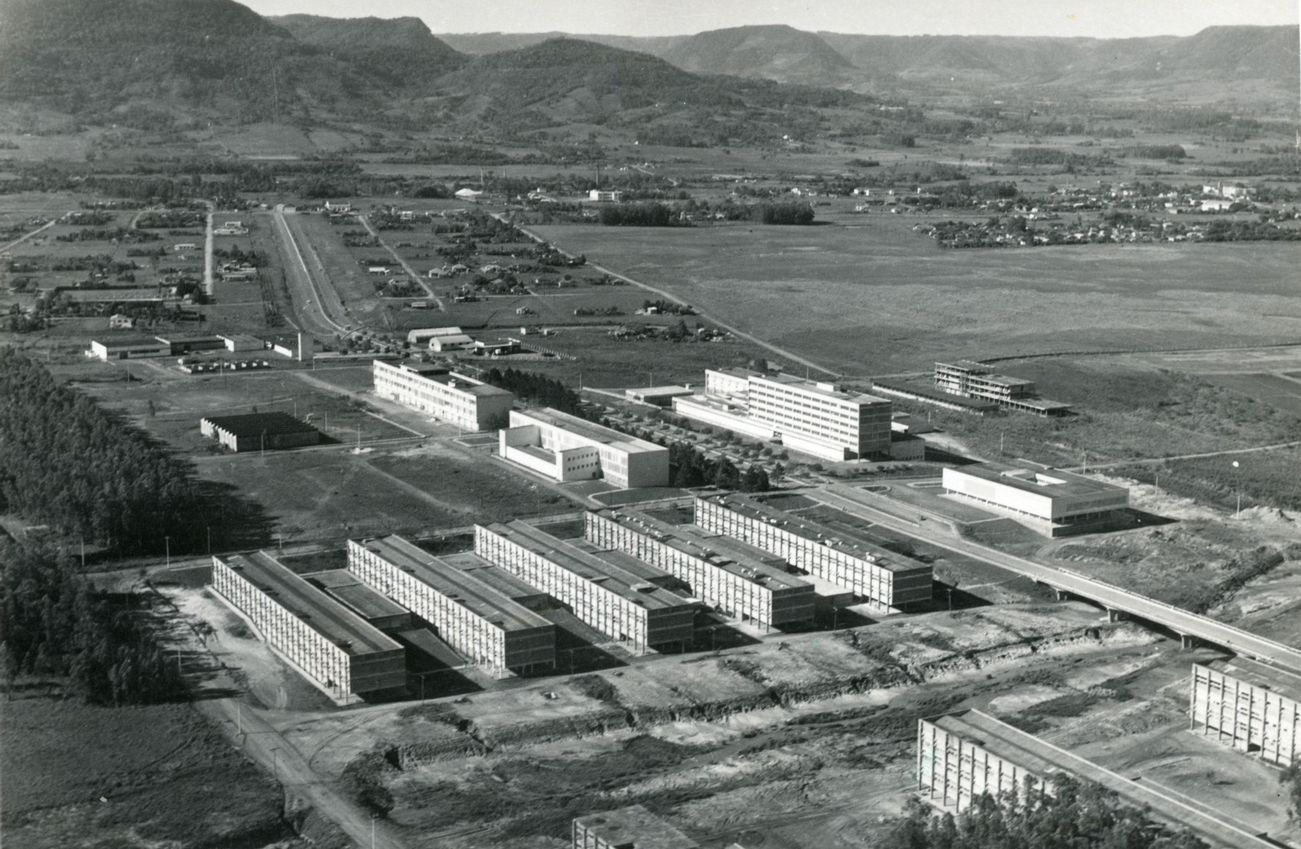 Fotografia horizontal preto e branca da vista aérea da Avenida Roraima e os prédios do Centro de Estudos Básicos, Biblioteca Central, Hospital Universitário, Centro de Tecnologia e Colégio Técnico Industrial do campus sede da UFSM. Ao fundo, morro com vegetação.
