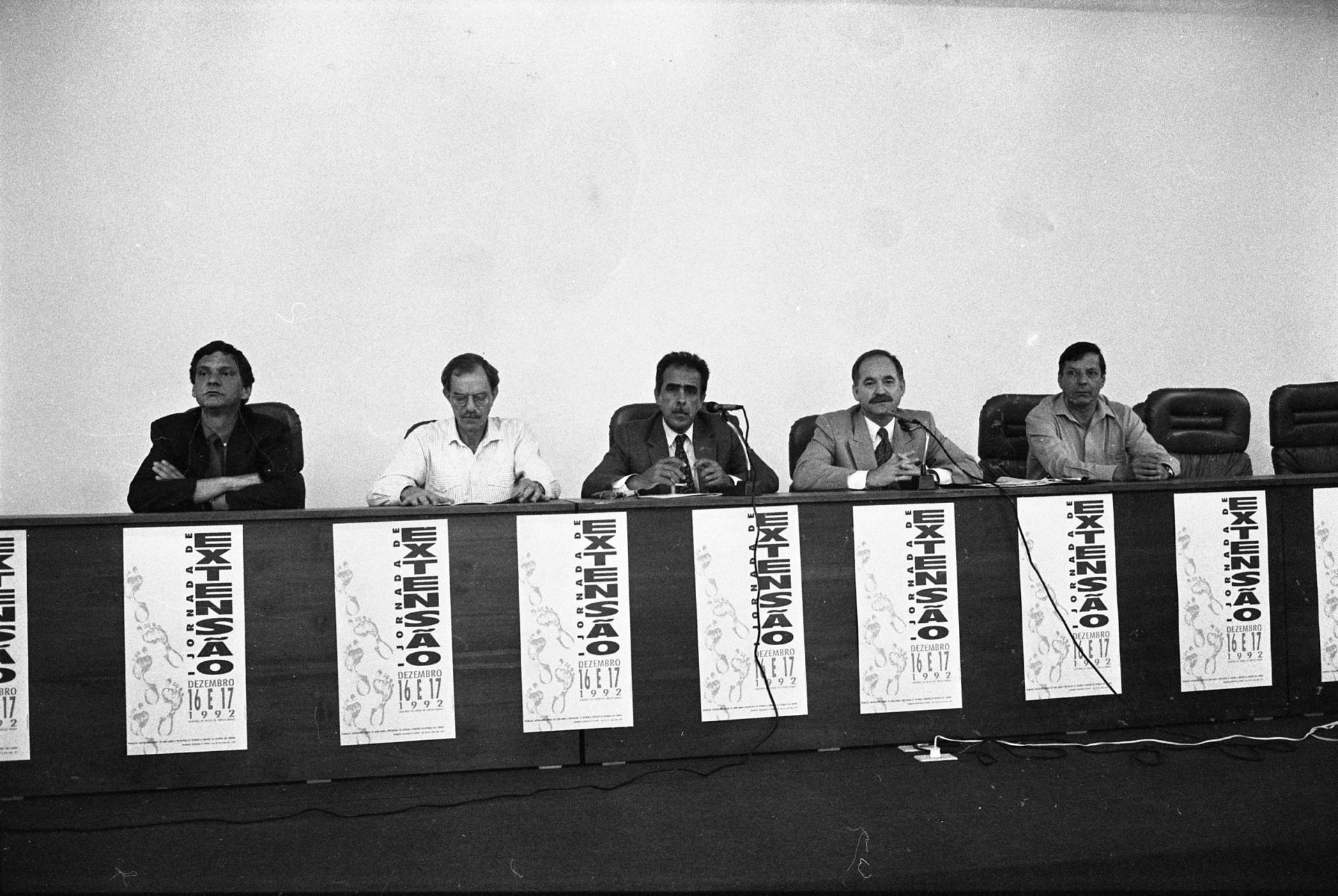 Fotografia horizontal preto e branca de 5 homens atrás de uma mesa retangular comprida. Ao longo da largura da mesa, 8 pôsteres verticais escrito I Jornada de Extensão Dezembro 16 e 17 1992. A parede do fundo é clara.