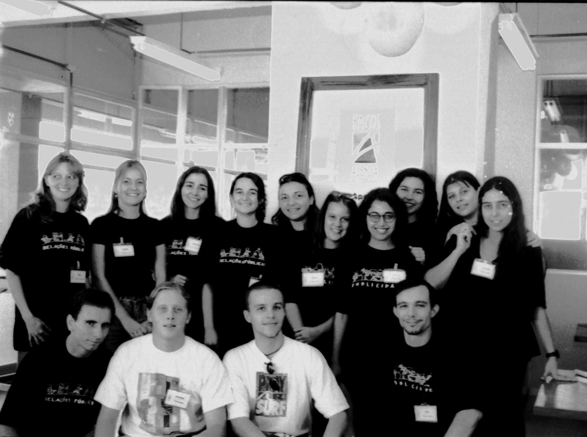 Fotografia horizontal preto e branca da Inauguração da Agência de Comunicação Integrada. Em pé, 10 mulheres, agachados a frente delas, 4 homens. Atrás das mulheres, um pilar claro e um quadro com um símbolo escrito FACOS Agência, de moldura escura. Ao fundo, paredes claras com janelas de vidro.