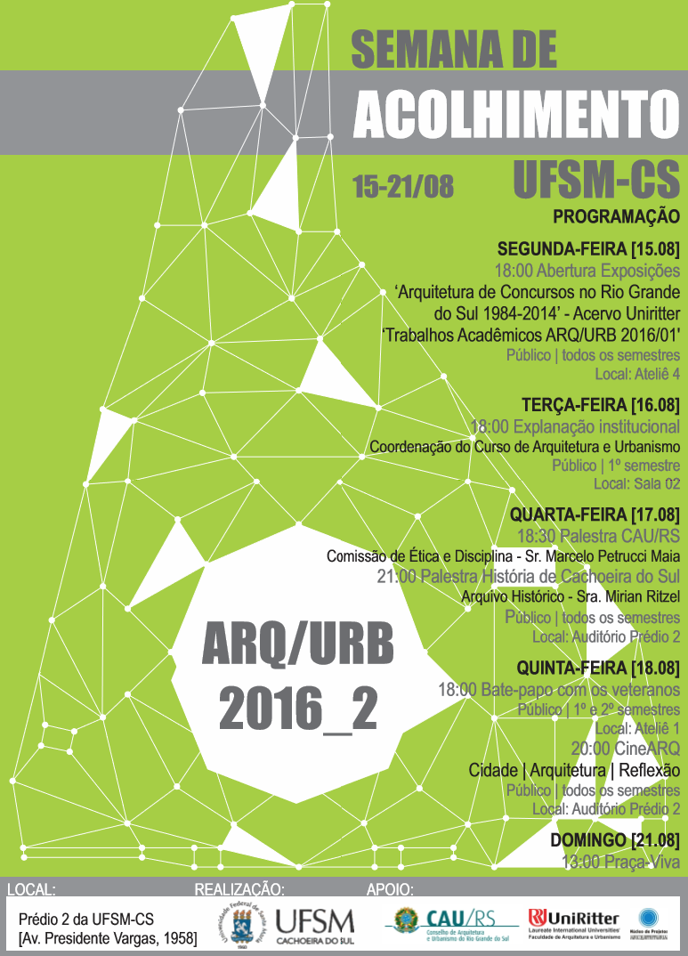 O curso de Arquitetura e Urbanismo irá realizar mais uma edição da Semana de Acolhimento entre os dias 15 a 19 de agosto. A programação conterá com exposições; explanação institucional com a coordenação do curso; palestras com Marcelo Petrucci Maia, da Comissão de Ética e Disciplina do CAU/RS, e Mirian Ritzel, do Arquivo Histórico do Cachoeira do Sul; bate-papo com os veteranos; e CineARQ.