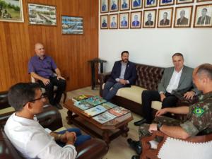 O diretor do da UFSM-CS, Rogério Brittes, o vice-diretor, Lucas Delongui, o pró-reitor de extensão, Flavi Lisboa e o reitor Paulo Burmann em conversa com o Tenente-Coronel Renato Farias Bazi.