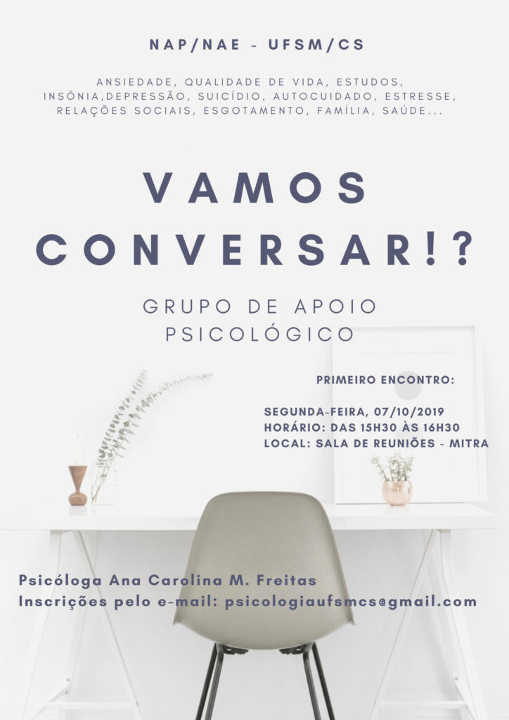 O Núcleo de Apoio ao Estudante (NAE) e o Núcleo de Apoio Pedagógico (NAP) da UFSM – Campus Cachoeira do Sul estão iniciando o programa “Vamos Conversar?”, um grupo de apoio psicológico que busca auxiliar os estudantes a lidarem com questões que permeiam a vida acadêmica, como  ansiedade, esgotamento, relações sociais, depressão, autocuidado, estresse, entre outros.