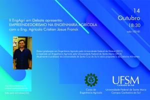 No dia 14 de outubro, o curso de Engenharia Agrícola irá realizar o II EngAgri em Debate. Esta edição do evento trará o tema “Empreendendorismo na Engenharia Agrícola”. O convidado é o Engenheiro Agrícola Cristian Josué Franck. O evento acontecerá na sala 102-B1 do campus definitivo, às 18h30min.