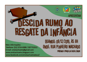 A ideia da “Descida Rumo ao Resgate da Infância é promover a interação familiar para a construção do carrinho, com o intuito de aproximar as gerações distintas para a construção do brinquedo. O evento faz parte de um projeto de extensão da UFSM-CS que busca o resgate lúdico da infância, por intermédio da fabricação de brincadeiras de baixo custo, na cidade de Cachoeira do Sul/RS e região. O projeto ainda visa a ocupação de espaços públicos pela comunidade, além de incentivar o reuso e/ou reciclagem de materiais na confecção dos brinquedos.