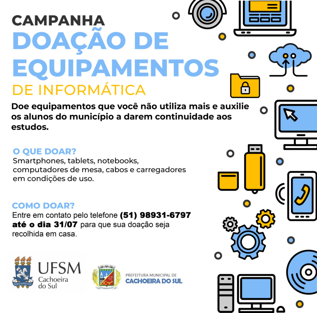 A Universidade Federal de Santa Maria (UFSM), através da Pró-Reitoria de Extensão (PRE), em parceria com o Campus e com a Prefeitura Municipal de Cachoeira do Sul, por meio da Secretaria de Educação, está promovendo uma campanha de arrecadação de equipamentos de informática para alunos da Rede Pública Municipal de Ensino.