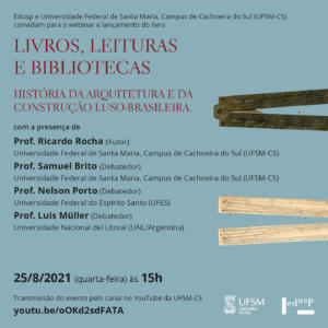O campus da UFSM em Cachoeira do Sul, em parceria com a Edusp, realizará o webinar e o lançamento online do livro “Livros, Leituras e Bibliotecas: História da Arquitetura e da Construção Luso-Brasileira”, de Ricardo Rocha, professor do curso de Arquitetura e Urbanismo da UFSM-CS. O evento acontece no dia 25 de agosto (quarta-feira), às 15h, e será transmitido pelo canal da UFSM-CS no Youtube, através do link.