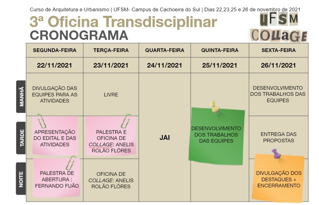 O curso de Arquitetura e Urbanismo do campus da UFSM em Cachoeira do Sul está realizando a sua 3ª. O tema desta edição é UFSM COLLAGE: [RE]CONHECER O LUGAR.