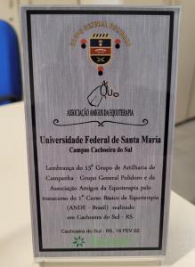 Na ocasião, a Direção da UFSM-CS recebeu uma lembrança em agradecimento ao apoio do campus da UFSM em Cachoeira do Sul, através de empréstimo de mesas e cadeiras que estão sendo utilizadas no evento.