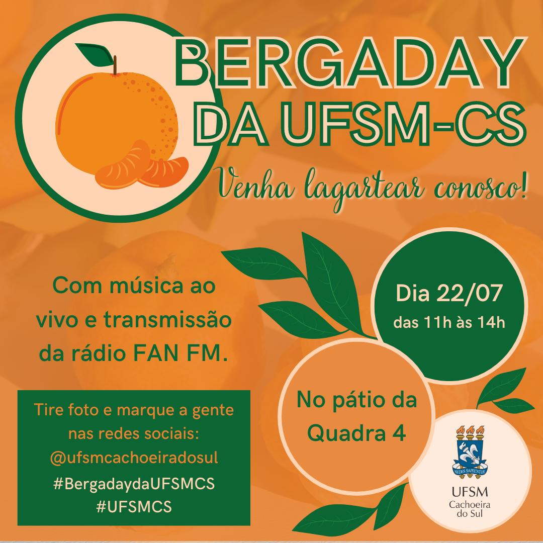 O campus da UFSM em Cachoeira do Sul irá promover um momento de lazer para a comunidade no intervalo do almoço nesta sexta-feira, dia 22 de julho: o Bergaday da UFSM-CS. Entre às 11h e às 14h, haverá, no pátio da quadra 4 do campus, um espaço para apresentações e distribuição de bergamotas. Também haverá transmissões on-line pela Rádio FAN FM, apoiadora do campus, através do edital de chamada pública realizado nos meses de maio e junho.