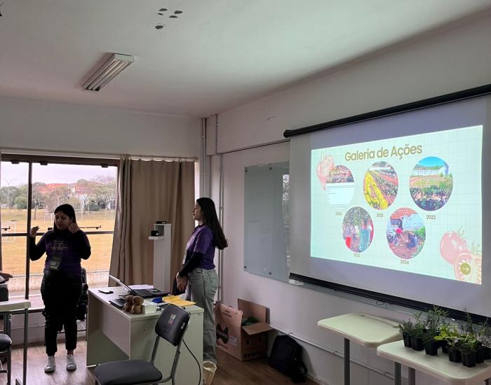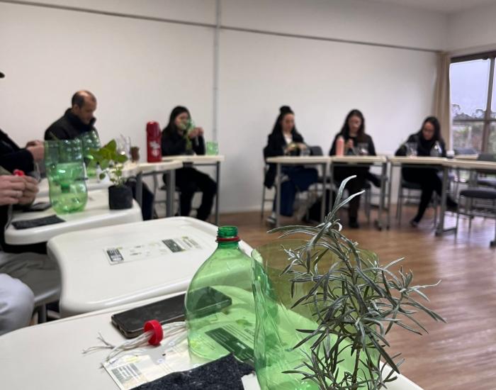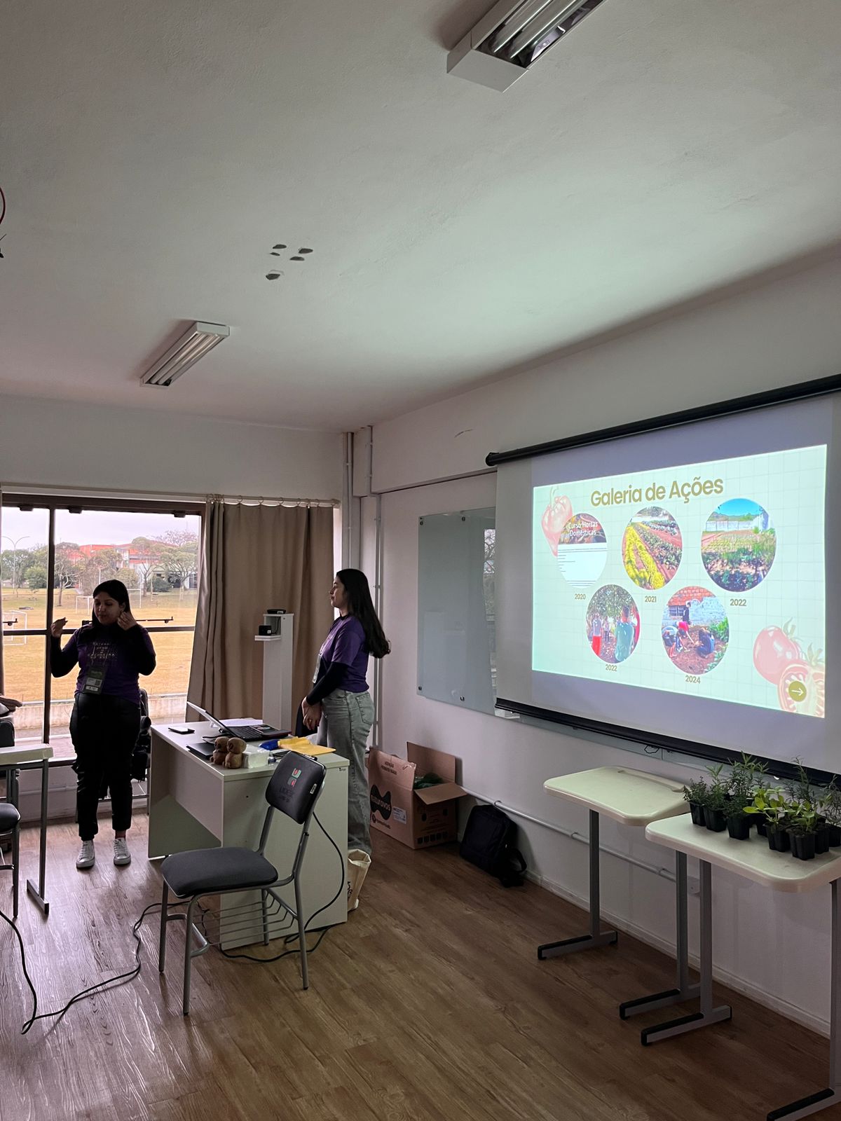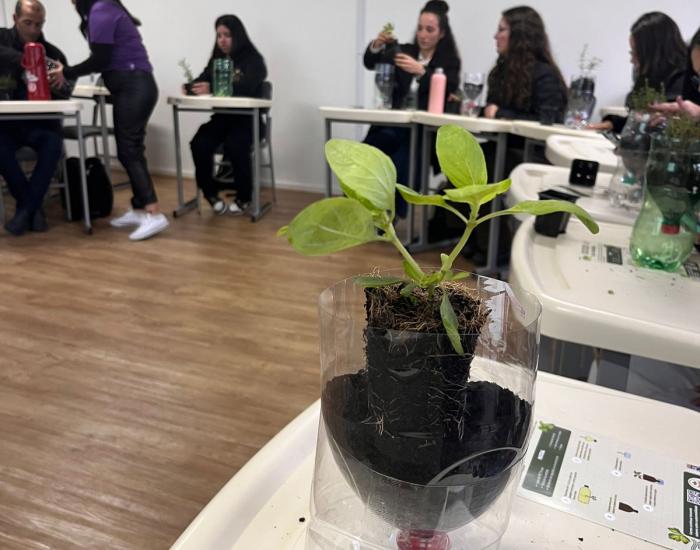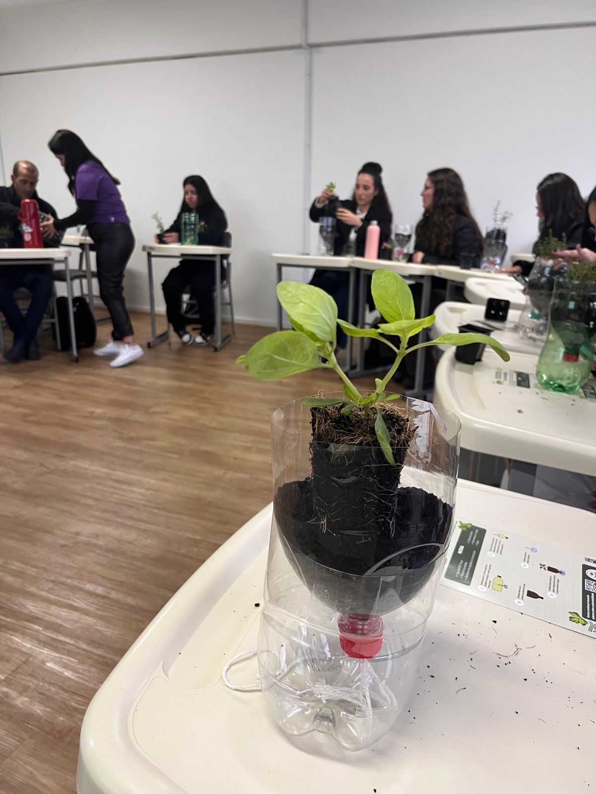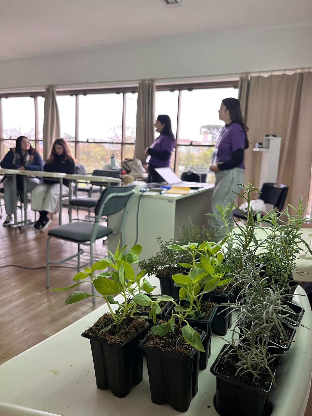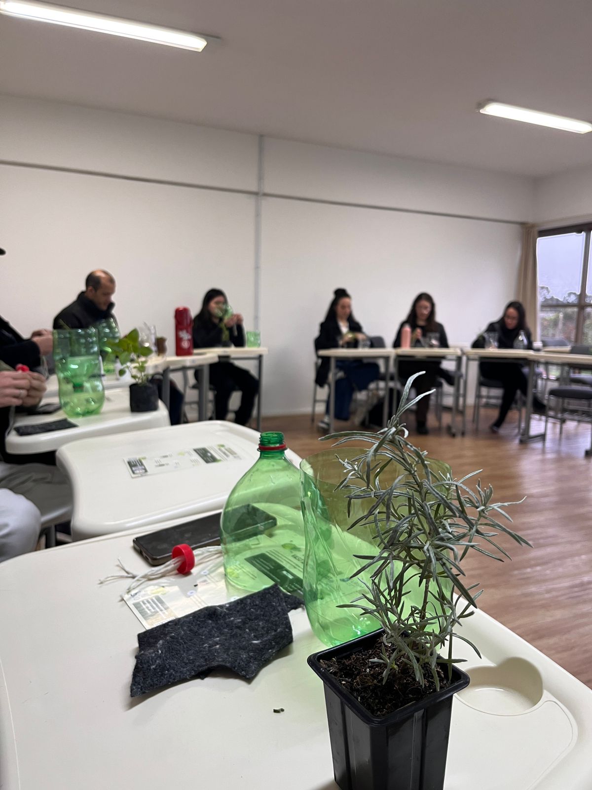 Com uma abordagem teórico-prática, a oficina envolveu o cultivo de mudas em recipientes reutilizáveis, como garrafas PET, e apresentou fundamentos ecológicos, nutricionais e sociais relacionados à agricultura urbana. Entre os destaques da atividade esteve a confecção de vasos autoirrigáveis, utilizando materiais simples e acessíveis, como tecido absorvente e garrafas plásticas, oferecendo uma solução prática e sustentável para o cultivo de plantas em pequenos espaços.