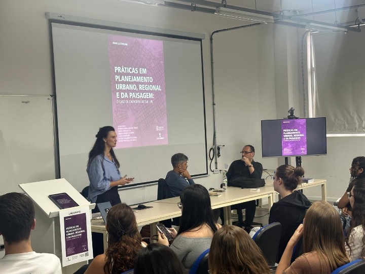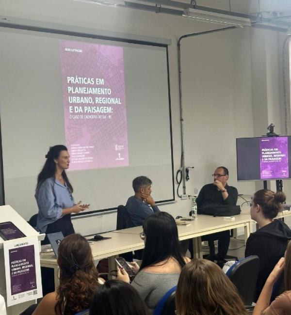 Na sequência, a professora Débora Gregoletto apresentou a obra Práticas em Planejamento Urbano, Regional e da Paisagem: o caso de Cachoeira do Sul – RS, da qual é uma das organizadoras. Publicado pela Editora da UFSM, o livro reúne contribuições de diferentes autores e apresenta reflexões sobre planejamento urbano e regional a partir de estudos e práticas desenvolvidas no contexto de Cachoeira do Sul.