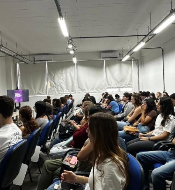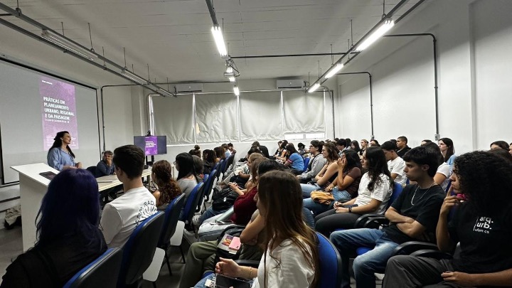O auditório esteve lotado ao longo da atividade, que contou com a participação expressiva de estudantes da graduação. A abertura do evento foi realizada pela professora Letícia Gabriel, coordenadora substituta do curso de Arquitetura e Urbanismo.