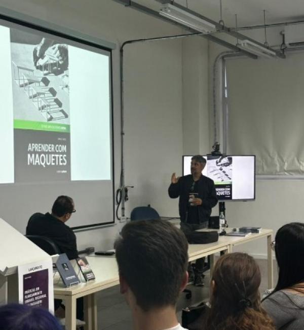Encerrando as apresentações, o professor Samuel Brito apresentou o livro Aprender com Maquetes, publicado pela Editora da UFSM, no qual discute o uso das maquetes como instrumento pedagógico no processo de ensino e aprendizagem em arquitetura.