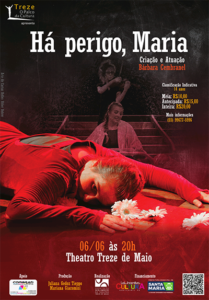 O espetáculo teatral Há Perigo, Maria, desenvolvido dentro do curso de Artes Cênicas da UFSM, pela artista-aluna Bárbara Cembranel, foi selecionado pelo edital Treze: O Palco da Cultura, e será apresentado no Theatro Treze de Maio, dia 06/06/2019 (Quinta-feira), às 20h. Os ingressos estão disponíveis na bilheteria do teatro (R$15,00 antecipado/sócios e R$10,00 meia entrada). A classificação indicativa é de 14 anos e a duração é de 60 min.