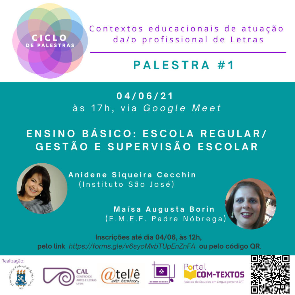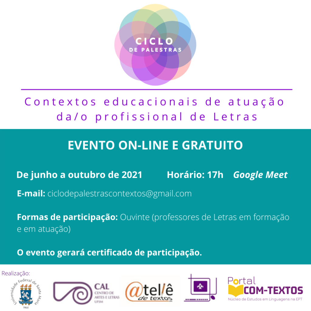 Promovido pelo Laboratório de Língua Portuguesa e Programa de Extensão Ateliê de Textos do DLV e pelo Portal Con-Textos do Colégio Politécnico da UFSM, o Ciclo de Palestras “Contextos educacionais de atuação da/do profissional de Letras”.
