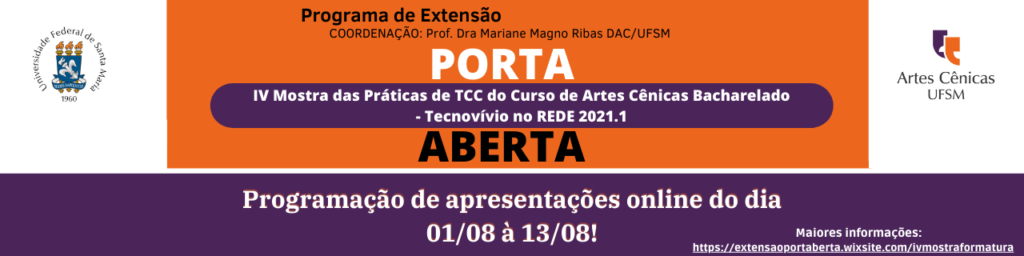 A IV  Mostra das Práticas de TCC do Curso de Artes Cênicas Bacharelado – Tecnovívio no REDE 2021.1 é uma ação extensionista, artística, acadêmica, remota e digital, com a finalidade de divulgar e publicar as práticas artísticas dos Trabalhos de Conclusão do Curso de Artes Cênicas Bacharelado Habilitação Interpretação Teatral e Habilitação Direção Teatral, desenvolvidas no Regime de Exercícios Especiais REDE/UFSM 2021.1. “Ao conceito de convívio, opomos a noção de tecnovívio, isto é, a cultura vivente desterritorializada por intermediação tecnológica.” (Dubatti, 2012, p.129). O evento visa a democratização e o acesso à Arte, bem como a formação de plateia e   também colabora com o avanço na reflexão crítica sobre os estudos cênicos digitais e sobre a mediação tecnológica necessária às práticas presenciais desenvolvidas no REDE/UFSM 2021.1, sendo situação de ensino, de pesquisa e de extensão imposta pelo contexto de suspensão das atividades presenciais. Sob tais circunstâncias, situações e contexto, o evento também colabora com as investigações e com as discussões sobre os diversos pontos de relação, de composição e de tensão entre a linguagem cênica presencial e a situação excepcional cênica digital e remota, no que se refere à imposição da ausência de presencialidade e de convívio. Condição pela qual abordamos os conceitos dubattianos convívio e tecnovívio para potencializar a discussão.