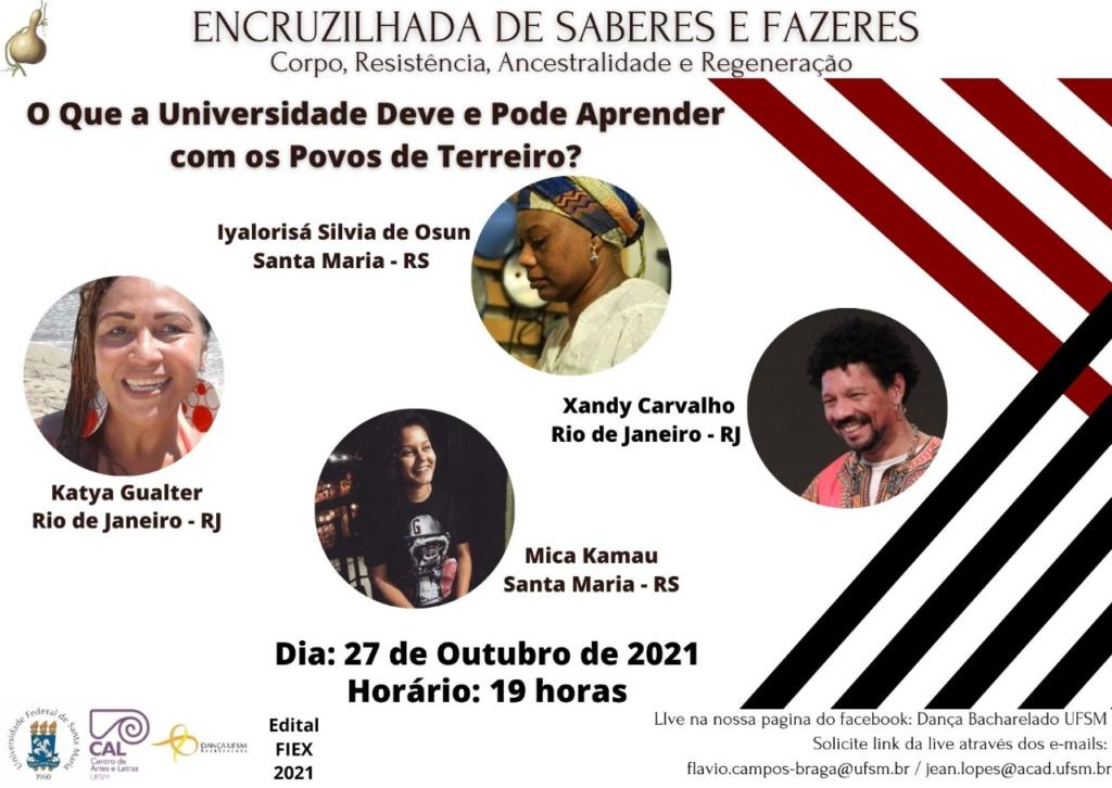 O que a Universidade deve e pode aprender com os povos de terreiro? Este é o tema da quarta roda de conversa da edição 2021 da ação de extensão Encruzilhada de Saberes e Fazeres: Corpo, Resistência, Ancestralidade e Regeneração. Nesse encontro, que será realizado no dia 27 de outubro às 19h, iremos concretizar o encontro entre os saberes das tradições populares e a universidade, numa trama de encantamentos e de descarregos que pretende ser repleta de propostas e provocações para nossas atuações no ensino, na pesquisa, na extensão e nas relações de afeto que sustentam nossas existências.