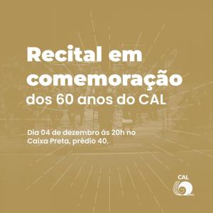 Continuando com as atividades de encerramento das comemorações dos 60 anos do CAL, no dia 04 de dezembro acontecerá um Recital, que contará com a presença de diversos alunos e professores.