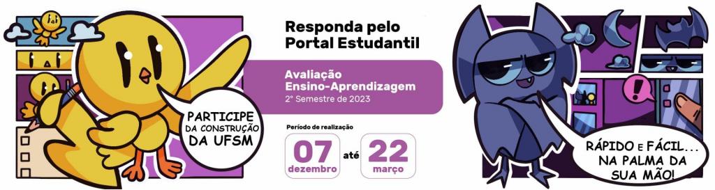 Já esta aberta a avaliação ensino-aprendizagem do segundo semestre de 2023! Ela estará disponível no Portal Estudantil e no aplicativo UFSM Digital até o dia 22 de março de 2024. A sua participação é muito impostante para a realização de ações de aprimoramento de docentes e gestores!