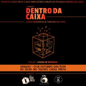 O Projeto de Extensão Caixa Preta Caixa Aberta (FIEX) e o Grupo de Pesquisa Dentro da Caixa convidam para o evento “Dentro da Caixa: Jogos Modernos de Tabuleiro”. Será uma tarde de muita diversão no Teatro Caixa Preta, no dia 12 de outubro, a partir das 15 horas. O evento irá disponibilizar os principais jogos de tabuleiro que estão em circulação atualmente, tais como Dixit, Carcassonne, Catan, Ticket to Ride, Pandemic, Splendor, Azul, Exploding Kittens, entre outros. Para participar não é preciso ter experiência, nem levar os jogos, pois no local haverá monitores e tabuleiros à disposição.