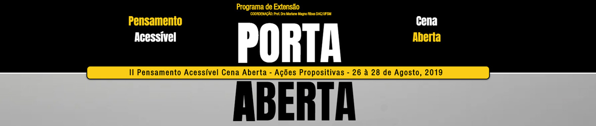 O II Simpósio Pensamento Acessível Cena Aberta – Ações Propositivas abre o diálogo a docentes e discentes de escolas públicas e privadas, seus familiares, estudantes de graduação e de pós-graduação e a todo cidadão interessado em conhecer e discutir o tema. Desse modo, como ação do Programa de Extensão Porta Aberta, objetiva-se colocar em evidência ações inventivas que se firmam como espaços vivos e verdadeiros à transformação social e que colaboram com o amadurecimento prático do pensamento democrático.