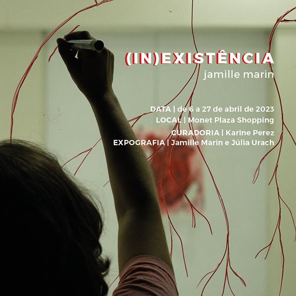 Guiada pela poesia intimista e influenciada pelas teoria existencialistas e de identidade, bem como pela área da psicanálise, Jamille Marin, nas obras que compõem a exposição (In)existência, transita entre a ausência e a presença de matéria, através do procedimento de queima e da materialidade/imaterialidade do fogo. No entanto, o que pode ser visto não é o fogo propriamente dito, mas os seus vestígios, indicadores de que ele esteve ali, deixando seus rastros sobre o suporte e sobre os diversos materiais usados, corroendo partes de pinturas figurativas de nosso órgão vital: o coração. Este é pintado retratando suas cavidades, válvulas e camadas, as quais são queimadas, esburacadas, fissuradas, rasuradas, manchadas e até mesmo perfuradas por arames escuros de fuligem, o que pode denotar o poder agressor do fogo. No entanto, cabe ressaltar que este é um fogo de certa forma controlado pela artista, que premedita os locais de sua inserção. Existência gasosa, presença ausente, o fogo existente e inexistente no trabalho, potencializa reflexões sobre os significados da sua capacidade ambígua: ao mesmo tempo que tem o potencial de causar dano físico e de servir como força destrutiva, também acolhe e aquece, sendo um dos maiores responsáveis pela sobrevivência da humanidade, ao longo dos tempos.