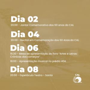 As comemorações dos 60 anos do CAL estão chegando ao fim e para o encerramento preparamos algumas atividades para a comunidade!