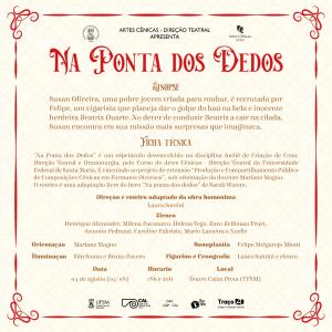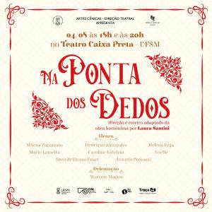 “Na Ponta dos Dedos” é um espetáculo desenvolvido na disciplina Ateliê de Criação de Cena: Direção Teatral e Dramaturgia, pelo Curso de Artes Cênicas – Direção Teatral da Universidade Federal de Santa Maria. É vinculado ao projeto de extensão