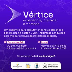 O Departamento de Desenho Industrial da UFSM promove o Evento “Vértice: experiência, interface e mercado”, organizado pelos alunos do Laboratório de Interfaces do curso de Desenho Industrial da Universidade Federal de Santa Maria (UFSM), com supervisão e idealização da professora Débora Aita Gasparetto e do profissional da área Carlos Donaduzzi. O evento é gratuito e aberto à comunidade.