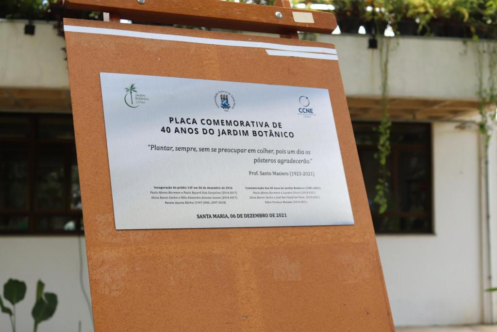 A placa inaugurada contempla a frase do professor Santo Masiero (in memorian): “Plantar sempre, sem pensar em colher, pois um dia os pósteros agradecerão”. Na ocasião, foram chamados para o descerramento da placa o Reitor da UFSM, Paulo Afonso Burmann, o Vice-reitor Luciano Schuch, a Diretora do CCNE, Sônia Zanini Cechin, e o Diretor do JBSM, Fábio Menezes.