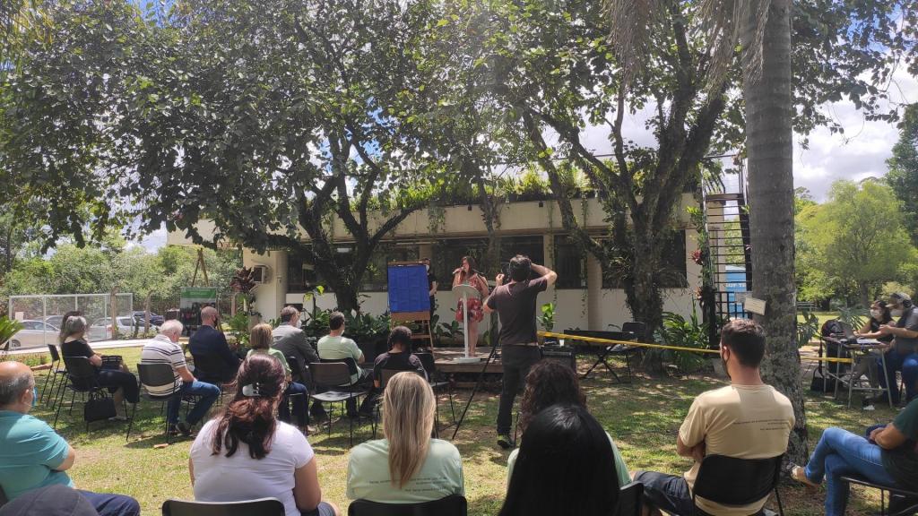 A servidora Simone anuncia, no final de sua fala, dois grandes projetos para os próximos anos: a criação do Grupo Interdisciplinar de Pesquisa e Extensão do Jardim Botânico, onde irão agregar diversos servidores e estudantes das ciências naturais e da área da educação e a utilização do JBSM como espaço da curricularização da extensão universitária.