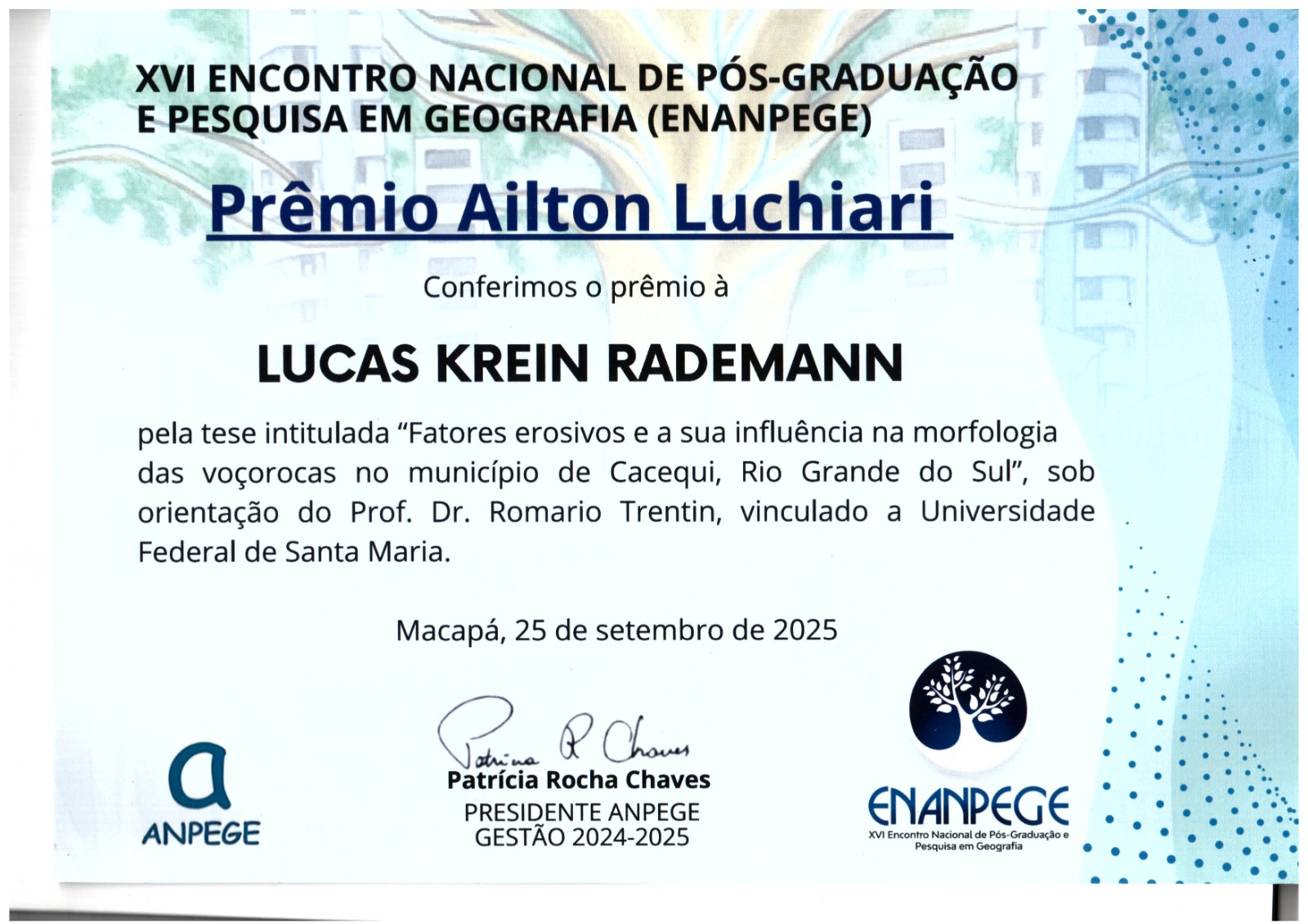 O pesquisador Lucas Krein Rademann foi reconhecido com o Prêmio Ailton Luchiari durante o XVI Encontro Nacional de Pós-Graduação e Pesquisa em Geografia (ENANPEGE), realizado em Macapá, no dia 25 de setembro de 2025.