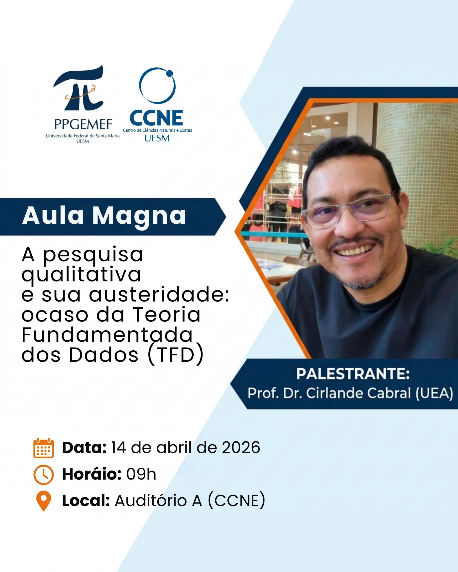 O Pós-Graduação em Educação Matemática e Ensino de Física (PPGEMEF) promove, na próxima terça (14), às 9h, a aula magna “A pesquisa qualitativa e sua austeridade: o caso da Teoria Fundamentada dos Dados (TFD)”. O evento acontece no Auditório A do CCNE e contará com a participação do professor e pesquisador Cirlande Cabral, da Universidade do Estado do Amazonas (UEA).