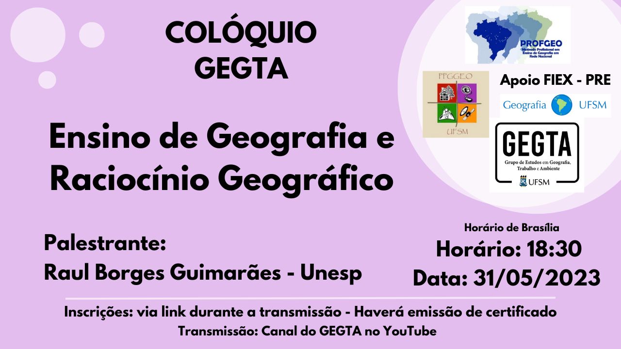 O Colóquio GEGTA, promovido pelo “Grupo de Estudos: Geografia, Trabalho, Ambiente”, consiste em um evento com a finalidade de promover a apresentação e debate de temas pertinentes ao ensino, pesquisa e extensão em Geografia.
