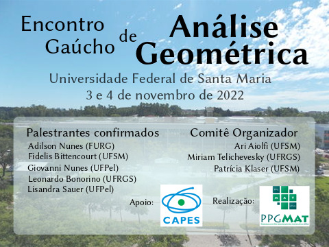 O Encontro Gaúcho de Análise Geométrica reúne pesquisadores e estudantes da área para divulgação de suas pesquisas em palestras de 20 à 25 min, se conheçam e talvez iniciem novas colaborações. O evento é voltado para pesquisadores da área e estudantes do final da graduação em matemática