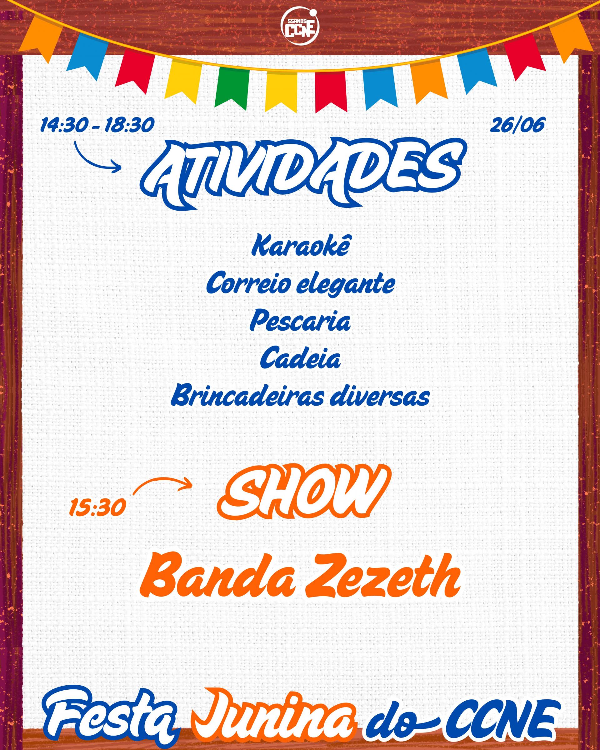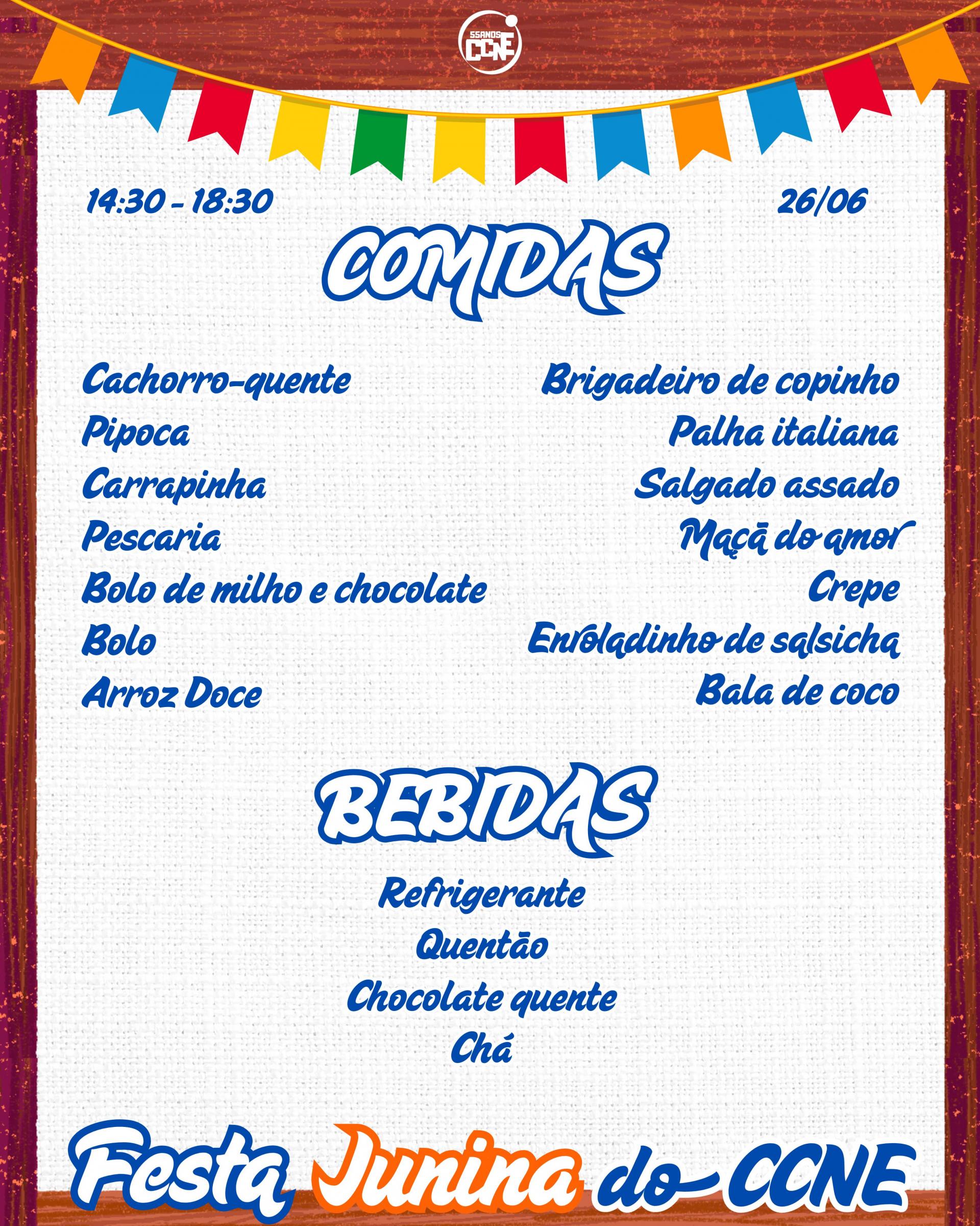 Prepare o traje caipira, a animação e o apetite,  um evento pra lá de bão, cheio de música, comida típicas, brincadeiras e aquele clima acolhedor que só o CCNE tem!