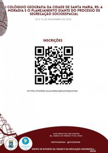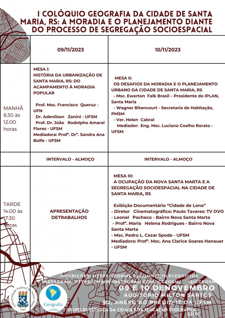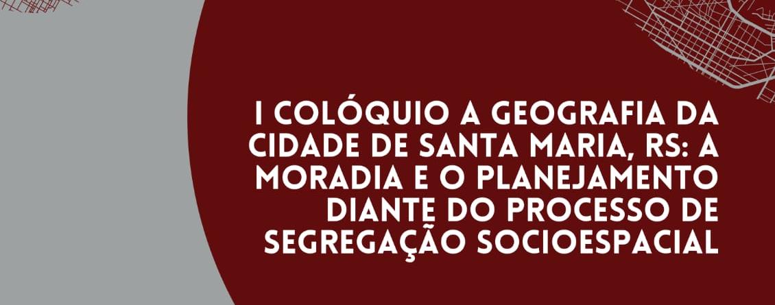 O Colóquio de Geografia Urbana é um evento de grande relevância na área de Geografia que se justifica pela sua contribuição para o conhecimento, o debate e as reflexões sobre a cidade de Santa Maria, localizada no estado do Rio Grande do Sul. Santa Maria é um lugar de moradia, estudo, ensino, pesquisa e extensão da Universidade Federal de Santa Maria (UFSM). Além disso, o evento busca levar à comunidade local o debate e a valorização do conhecimento científico e cultural relacionados à cidade, especialmente no que diz respeito aos direitos à cidade, com ênfase na moradia. Este evento reunirá tanto acadêmicos quanto membros ativos no movimento pela luta por moradia na região.