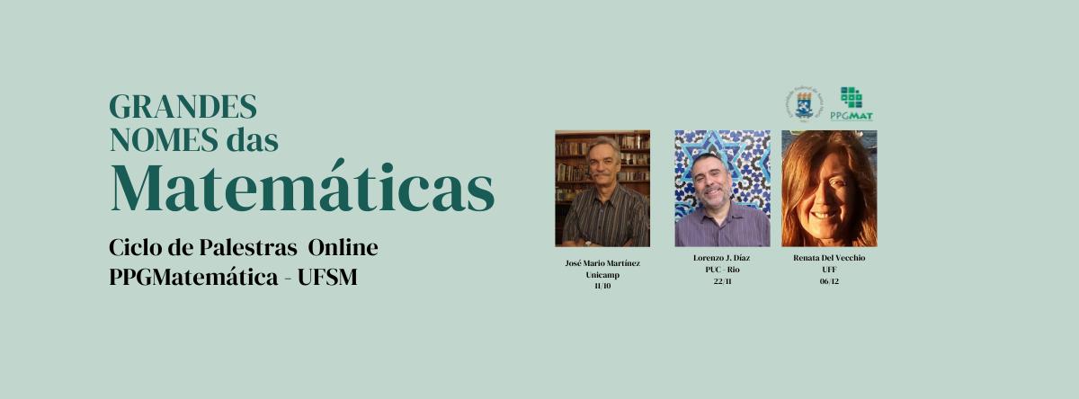O ciclo de palestras “Grandes Nomes das Matemáticas” é um projeto que visa oferecer palestras de alto nível à comunidade docente e discente da UFSM. Mensalmente, será convidado(a) um(a) pesquisador(a) de destaque no cenário nacional para fazer uma palestra online sobre pesquisas nas mais diversas áreas da Matemática e Matemática Aplicada.