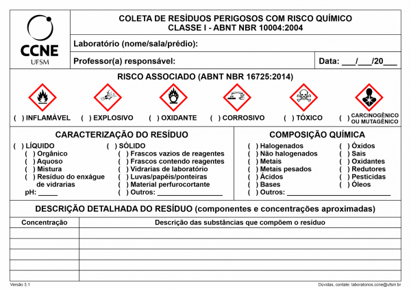 ATENÇÃO: quando necessária a coleta dos resíduos para destinação, escrever para laboratorios.ccne@ufsm.br a fim de que a empresa seja acionada. Embalagens para acondicionamento de resíduos podem ser retiradas no Depósito de Produtos Químicos do CCNE nos dias e horários de coleta de resíduos químicos descritos no quadro acima. |