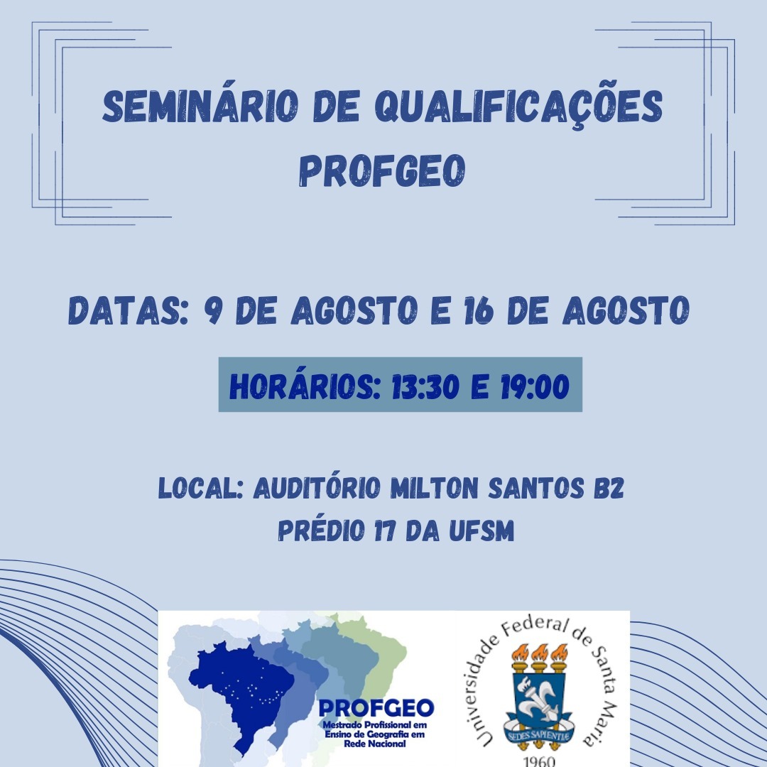 O Mestrado Profissional em Ensino de Geografia em Rede Nacional (PROFGEO) realizará nos dias 09 e 16 de agosto do corrente ano, o Seminários de Qualificações da turma de 2023. Serão dois dias de atividades em que o corpo discente poderá explanar os projetos em desenvolvimento. A atividade é aberta para à todos os interessados na temática do Ensino de Geografia e formação continuada de professores. Os encontros acontecerão no Auditório B2 – Milton Santos, anexo ao prédio 17 da UFSM, nos períodos da tarde (início às 13h30) e noite (início às 19h).