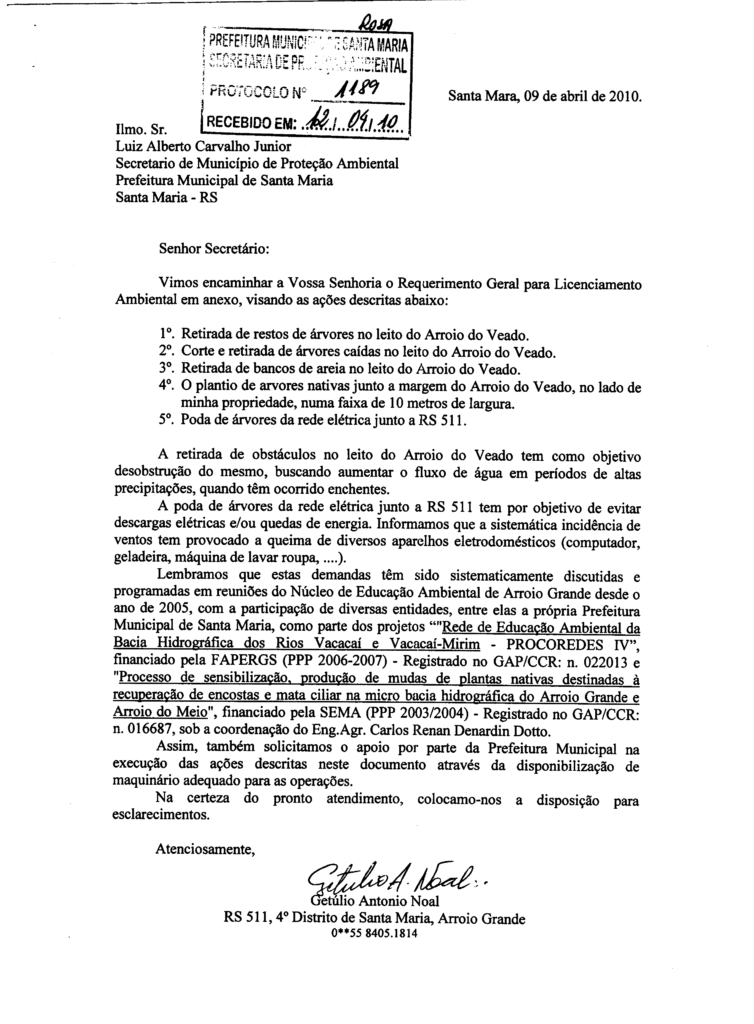 Protocolado na Secretaria Municipal de Proteção Ambiental da Prefeitura de Santa Maria o “Requerimento Geral para Licenciamento Ambiental” visando mutirão de limpeza e plantio de árvores nativas junto à margem do Arroio Veado, afluente do Arroio Grande
