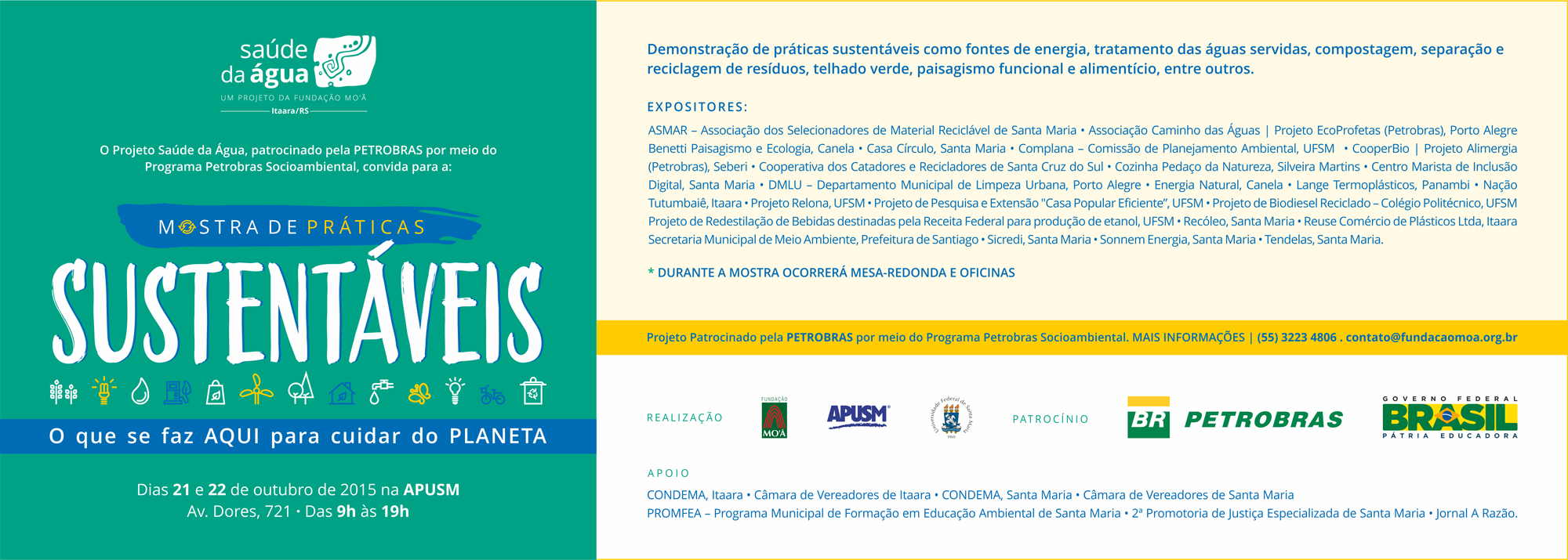 Este Projeto da Fundação MO’Ã, que ocorre nos dias 21 e 22 de outubro, na sede da APUSM, tem o objetivo depromover o debate sobre ações de sustentabilidade.