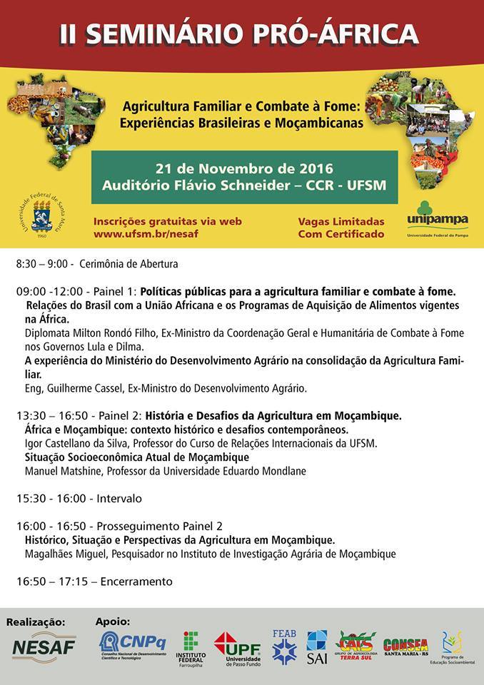 No dia 21/11/2016 (segunda-feira) acontecerá na Universidade Federal de Santa Maria o II Seminário Pró-África, com o tema “Agricultura Familiar e Combate à Fome: Experiências Brasileiras e Moçambicanas”.