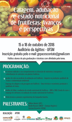 No período de 15 até 18 de outubro de 2018 será ministrado na Universidade Federal de Santa Maria (UFSM), o curso Calagem, adubação e estado nutricional de frutíferas: avanços e perspectivas. O curso será ministrado pelos professores William Natale (Universidade Federal do Ceará), também é Editor chefe da revista brasileira de fruticultura; Danilo Rozane (Universidade do Estado de São Paulo – Campus Registro) e Gustavo Brunetto (Universidade Federal de Santa Maria). Todos os professores possuem longa experiência técnica e científica nas temáticas que serão abordadas no curso.