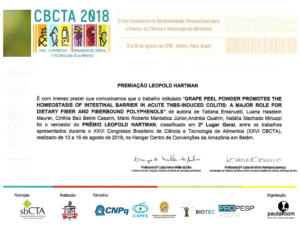 Confira abaixo o certificado com os dados do trabalho e da premiação, que é promovida pela Sociedade Brasileira de Ciência e Tecnologia de Alimentos (SBCTA) e concedida aos melhores trabalhos apresentados no Congresso Brasileiro de Ciência e Tecnologia de Alimentos – evento bienal e constitui-se em um dos maiores eventos da área no Brasil.