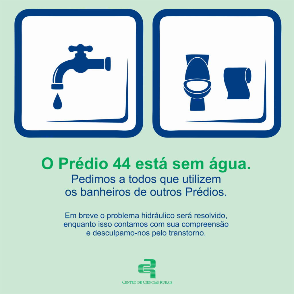 O Prédio 44 está temporariamente sem água. A Direção do Centro de Ciências Rurais solicita a todos que utilizem os banheiros de outros Prédios.