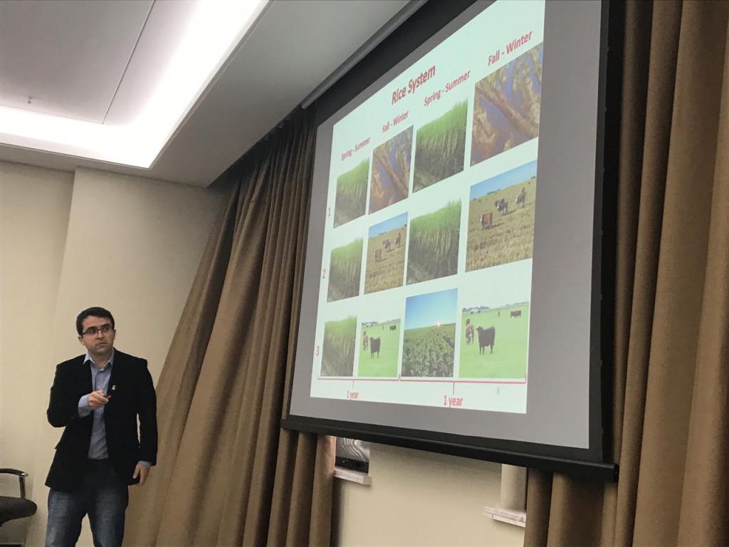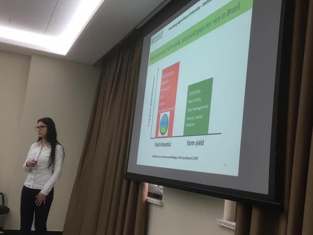 O professor Alencar e a Giovana proferiram as palestras “Potential and actual yield: causes of yield gap for irrigated and rainfed rice in Brazil” e “Potential for sustainable intensification of rice in Southern Brazil”, respectivamente para professores e estudantes do Departamento de Fisiologia de Produção da Universidade Chinesa.